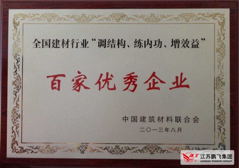 為樹立典型,有效遏制經(jīng)濟(jì)效益下滑,推進(jìn)建材行業(yè)調(diào)整結(jié)構(gòu)和轉(zhuǎn)型升級,弘揚(yáng)正能量,發(fā)揮優(yōu)秀企業(yè)的典型示范作用,促進(jìn)行業(yè)科學(xué)發(fā)展,中國建材聯(lián)合會與各省市地方建材行業(yè)協(xié)會聯(lián)手開展推薦表彰“調(diào)結(jié)構(gòu)、練內(nèi)功、增效益”百家優(yōu)秀企業(yè)評比表彰活動。江蘇鵬飛集團(tuán)強(qiáng)抓市場機(jī)遇,堅持科學(xué)發(fā)展之路,創(chuàng)新經(jīng)營模式,被授予“調(diào)結(jié)構(gòu)、練內(nèi)功、增效益”百家優(yōu)秀企業(yè)榮譽(yù)稱號。