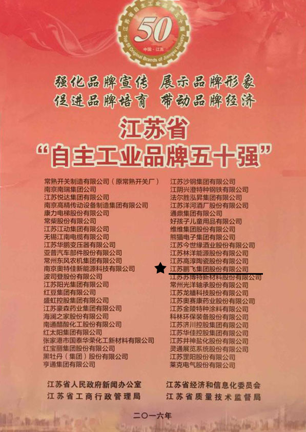 鵬飛集團入選2015年度“江蘇自主工業(yè)品牌50強”企業(yè)