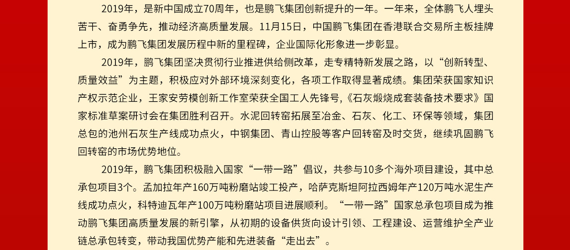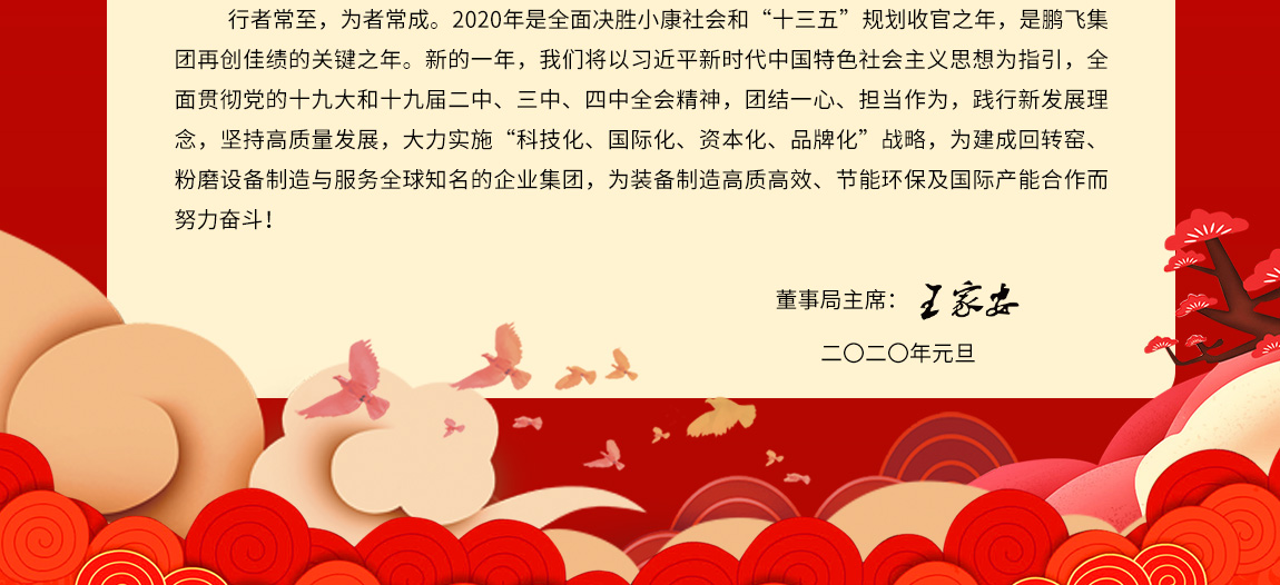 行者常至,為者常成。2020年是全面決勝小康社會(huì)和“十三五”規(guī)劃收官之年,是鵬飛集團(tuán)再創(chuàng)佳績(jī)的關(guān)鍵之年。新的一年,我們將以習(xí)近平新時(shí)代中國(guó)特色社會(huì)主義思想為指引,全面貫徹黨的十九大和十九屆二中、三中、四中全會(huì)精神,團(tuán)結(jié)一心、擔(dān)當(dāng)作為,踐行新發(fā)展理念,堅(jiān)持高質(zhì)量發(fā)展,大力實(shí)施“科技化、國(guó)際化、資本化、品牌化”戰(zhàn)略,為建成回轉(zhuǎn)窯、粉磨設(shè)備制造與服務(wù)全球知名的企業(yè)集團(tuán),為裝備制造高質(zhì)高效、節(jié)能環(huán)保及國(guó)際產(chǎn)能合作而努力奮斗!