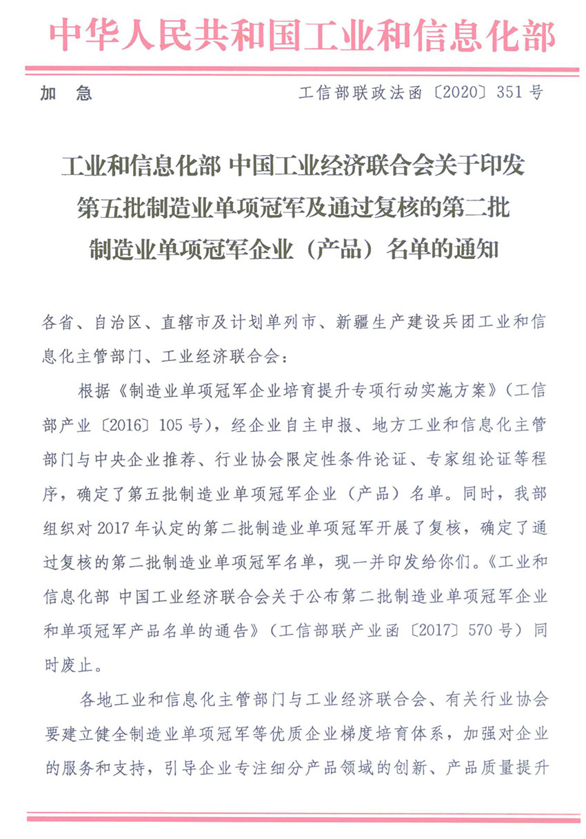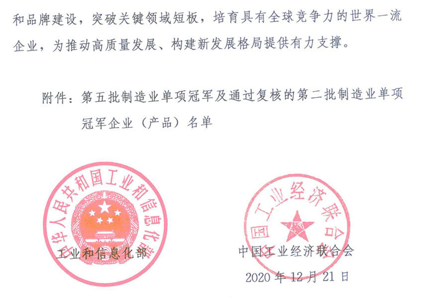 再次奪得“制造業(yè)單項(xiàng)冠軍示范企業(yè)”稱號