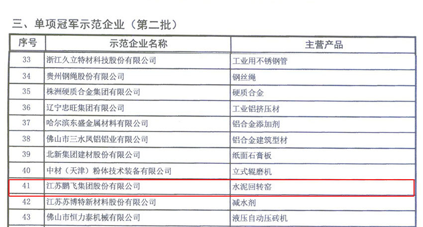 江蘇鵬飛集團(tuán)股份有限公司榮獲國家制造業(yè)單項(xiàng)冠軍示范企業(yè)稱號,憑借的是主營產(chǎn)品水泥回轉(zhuǎn)窯的雄厚制造實(shí)力。