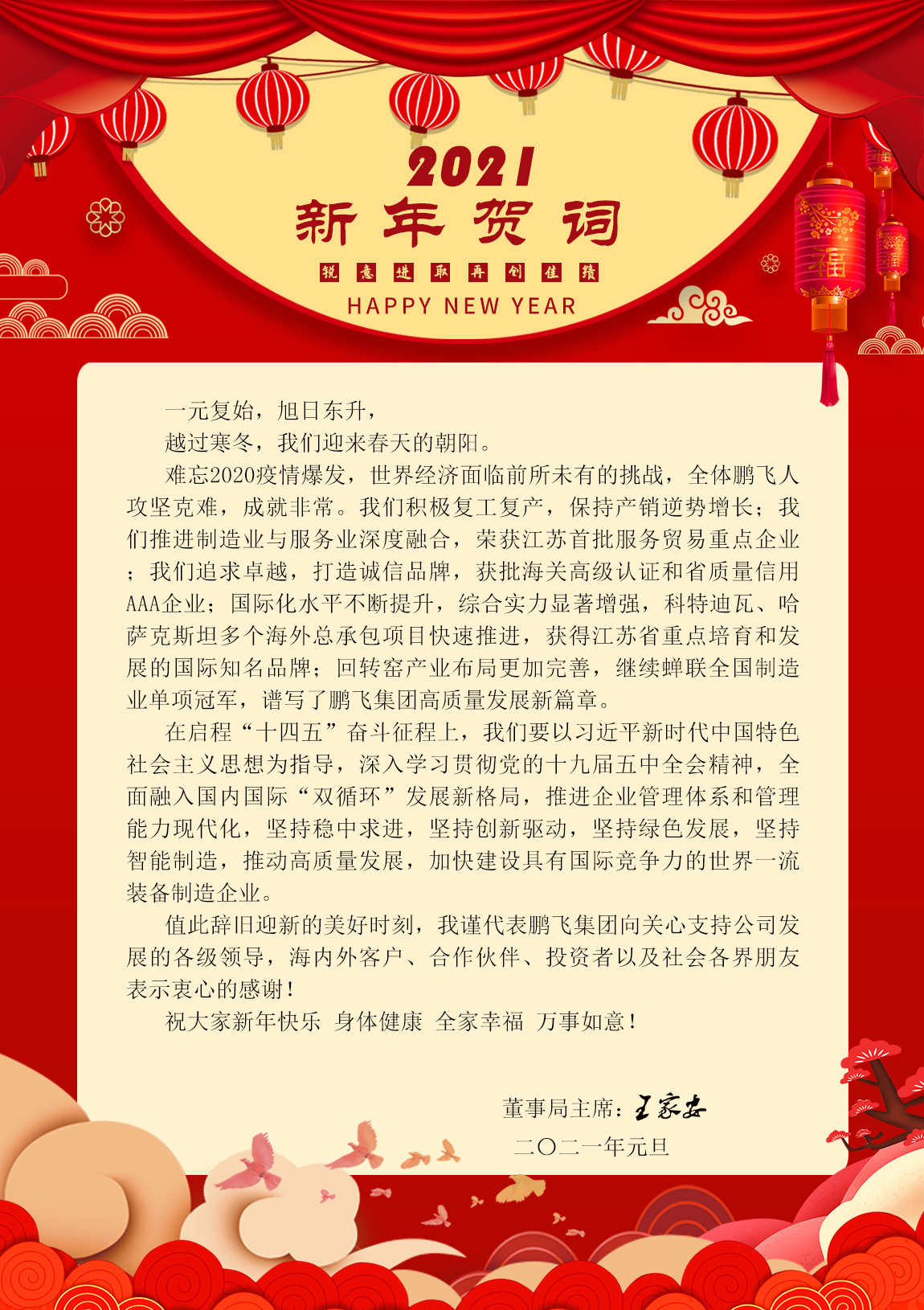 值此辭舊迎新的美好時刻,我謹(jǐn)代表鵬飛集團(tuán)向關(guān)心支持公司發(fā)展的各級領(lǐng)導(dǎo),海內(nèi)外客戶、合作伙伴、投資者以及社會各界朋友表示衷心的感謝!