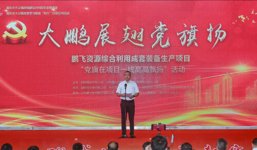 “今天活動(dòng)現(xiàn)場(chǎng)的‘鵬飛資源綜合利用成套裝備生產(chǎn)項(xiàng)目’是2021年江蘇省重大項(xiàng)目,南通市‘黨旗在項(xiàng)目一線高高飄揚(yáng)’活動(dòng)第一批啟動(dòng)項(xiàng)目。為了著力提升服務(wù)效能,健全重大項(xiàng)目服務(wù)機(jī)制,大公鎮(zhèn)牽頭組織成立項(xiàng)目臨時(shí)黨支部、項(xiàng)目服務(wù)專班,一刻不停推項(xiàng)目,讓黨旗飄揚(yáng)在項(xiàng)目一線;一著不讓抓發(fā)展,讓黨員沖鋒在項(xiàng)目一線;一以貫之優(yōu)環(huán)境,讓服務(wù)下沉到項(xiàng)目一線,著力辦實(shí)事、解難題,為推進(jìn)重大項(xiàng)目建設(shè)提供有力支撐和堅(jiān)實(shí)保障。”大公鎮(zhèn)黨委書(shū)記金山存說(shuō)。
