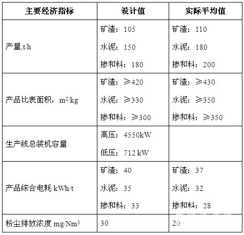 該生產(chǎn)線是按照年產(chǎn)60萬噸礦粉/100萬噸水泥設(shè)計,粉磨系統(tǒng)主要設(shè)備配置及性能參數(shù)見表1: