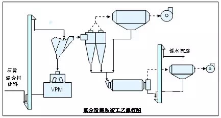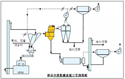 此工藝運(yùn)用于VPM立磨功率與球磨機(jī)功率比值大于0.5的場合,該系統(tǒng)主要優(yōu)點(diǎn)是系統(tǒng)產(chǎn)量高(增產(chǎn)100%以上),單位電耗低。