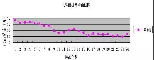 鑒于六七號磨機的狀況,我們對兩臺磨機停磨進磨觀察,六號磨機內兩倉料球比過高,進磨后看不到鋼球,物料高出一個鋼球的高度,正常情況下鋼球應該高出料面露出半個鋼球為最佳,隨現(xiàn)場測量計算六號磨一倉填充率為28.7%二倉為29.0%;七號磨機進磨觀察一倉鋼球露出料面一半,說明填充率應該是可以的,測量計算一倉的填充率為31.2%二倉為29.2%;這種磨機的最佳填充率一倉為30%左右二倉為31%左右。隨取七號磨樣做了磨機的篩余曲線,磨機均采用急停的停磨方式,入磨共取樣品24個做80um和200um的篩余。見圖1。