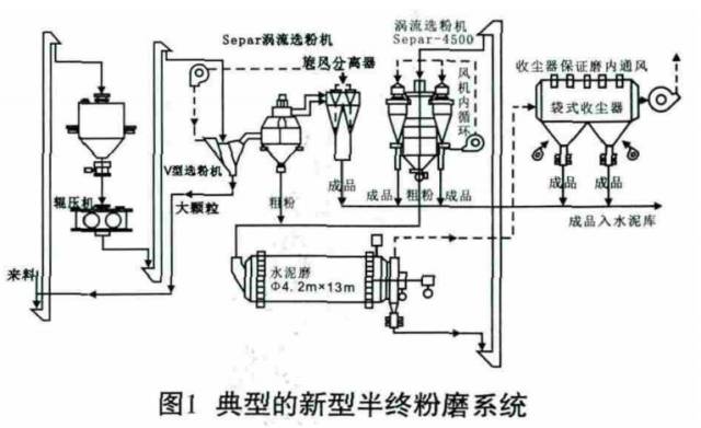 (4)隨著水泥粉磨工藝研究的不斷進(jìn)步,對傳統(tǒng)聯(lián)合粉磨系統(tǒng)的不斷優(yōu)化,“大輥壓機(jī)配小球磨機(jī)”的半終粉磨系統(tǒng)脫穎而出。與傳統(tǒng)聯(lián)合粉磨工藝系統(tǒng)相比,輥壓機(jī)半終粉磨工藝采用一臺物料處理能力較大的輥壓機(jī)和一臺喂料、分選能力大的下進(jìn)風(fēng)雙分離高效選粉機(jī),將V選后的細(xì)粉再次進(jìn)行分選,合格細(xì)粉從入磨前的物料中被分選出來并直接送入成品庫,中粗粉進(jìn)入球磨機(jī)進(jìn)行粉磨,大幅度提高了成品產(chǎn)量,改善了球磨機(jī)的工況,減少了過粉磨現(xiàn)象的發(fā)生。同時V型選粉機(jī)與雙分離高效選粉機(jī)共用一臺系統(tǒng)風(fēng)機(jī),取消了聯(lián)合粉磨系統(tǒng)中一臺循環(huán)風(fēng)機(jī)與旋風(fēng)收塵器及部分管道和輸送設(shè)備,進(jìn)而提高了球磨機(jī)的綜合臺時產(chǎn)量,降低了粉磨電耗,減少了設(shè)備數(shù)量和維修成本。典型的新型半終粉磨系統(tǒng)如圖1所示。