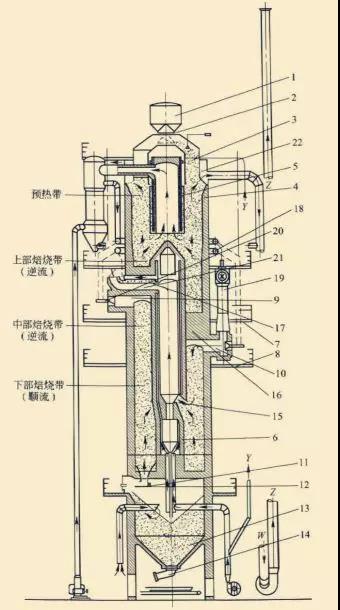 1.料斗;2.料口;3.加料斗;4.外筒;5.上內(nèi)筒;6.下內(nèi)筒;7.上燒嘴平臺;8.下燒嘴平臺;9.上燃燒室;10.下燃燒室;11.液壓推桿系統(tǒng);12.出料臺;13.石灰倉;14.振動出料機;15.循環(huán)氣體入口;16.拱橋;17.冷卻梁;18.環(huán)形管道;19.噴射器;20.燒嘴;21.循環(huán)氣體管道;22.環(huán)形煙道。