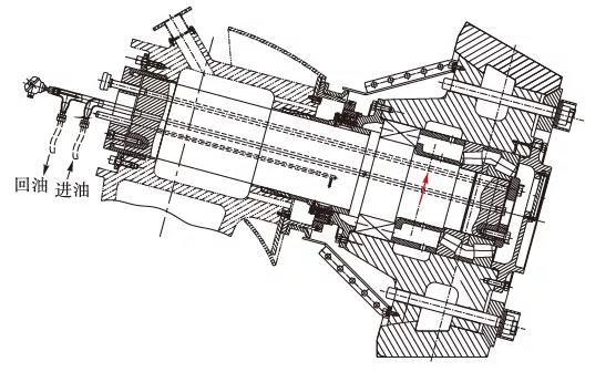 磨輥軸承潤滑是通過集中潤滑系統(tǒng)來實(shí)現(xiàn)的,通過稀油站向磨輥內(nèi)部供油,油品為460#極壓工業(yè)齒輪油。磨輥裝置結(jié)構(gòu)及潤滑油走向如圖1所示。