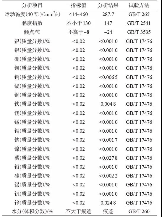 現(xiàn)場檢查發(fā)現(xiàn),磨輥腔體內(nèi)部油品發(fā)黑、油品黏度較低,現(xiàn)場對油品取樣進(jìn)行分析,結(jié)果如表1所示。由表1可以看出,該牌號油品40 ℃正常的運(yùn)動黏度應(yīng)該在460 mm2/s,實(shí)測值為287.7 mm2/s,水分超標(biāo),潤滑油本身碳化嚴(yán)重,品質(zhì)下降,鐵與鋅雜質(zhì)含量增加。從分析結(jié)果判斷,該型立磨使用的油品已不滿足磨輥軸承正常運(yùn)行所需要的油品條件。