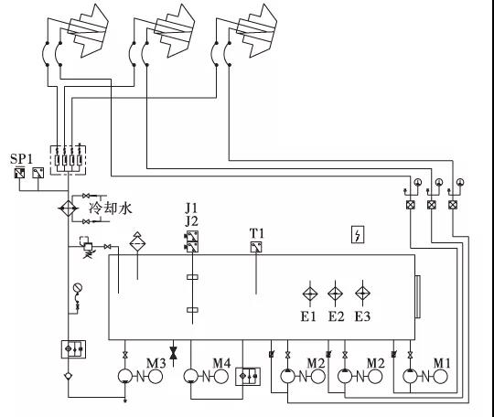 立磨潤滑系統(tǒng)原理如圖2所示,磨輥潤滑系統(tǒng)工作原理為:潤滑系統(tǒng)工作時,油液經(jīng)供油泵從油箱抽出,經(jīng)過濾器、冷卻器、分流器等進(jìn)入磨輥內(nèi)部,經(jīng)循環(huán)潤滑換熱后,由回油泵從磨內(nèi)強(qiáng)制抽出,送回油箱,潤滑系統(tǒng)通過循環(huán)往復(fù)實(shí)現(xiàn)磨輥的潤滑功能。單個磨輥供油泵分配流量為13 L/min,單輥配置一個能力為20 L/min的回油泵強(qiáng)制回油。