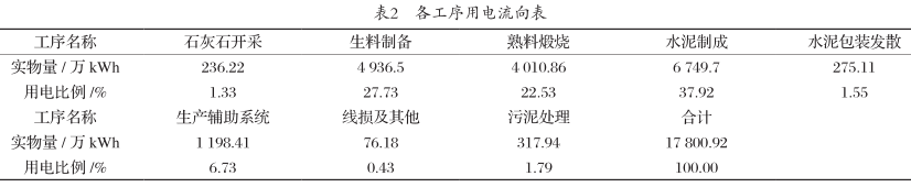 水泥企業(yè)電力消耗主要是設備動力拖動,一部分由社會電網提供,另外一部分由企業(yè)余熱發(fā)電廠提供。2018年企業(yè)外購電力13 688.15 萬kWh,余熱自發(fā)電4 112.77 萬kWh,合計17 800.92 萬kWh全部用于水泥生產。各工序用電流向如表2所示。