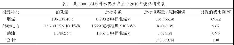 某水泥企業(yè),現有1條5000t/d新型干法水泥回轉窯生產線以及2臺180t/h水泥磨,具有年產普通硅酸鹽水泥熟料150萬t和年產硅酸鹽水泥160萬t的生產能力。主要產品為PO42.5和PS32.5A水泥。主要消耗的能源為煙煤、電力、柴油等。主要生產工序包括石灰石礦山開采、生料制備、熟料煅燒、水泥制成。2018年該企業(yè)綜合能耗為175078.44噸標準煤。主要能源消費情況如表1所示。